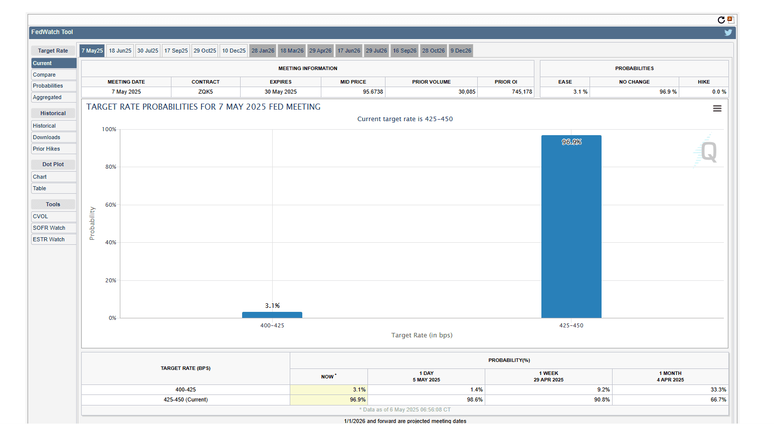There is a 97% probability of no rate change at 4.50%, looking at the CME FedWatch Tool.