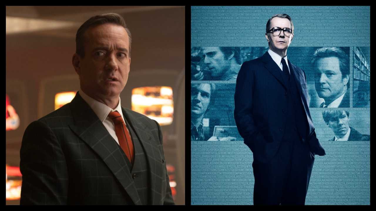 (Left) Matthew Macfadyen as Mr. Paradox in 20th Century Studios/Marvel Studios’ ‘Deadpool & Wolverine’. Photo courtesy of 20th Century Studios/Marvel Studios. © 2024 20th Century Studios / © and ™ 2024 Marvel. (Right) Gary Oldman as George Smiley in ‘Tinker Tailor Soldier Spy’. Photo: StudioCanal.