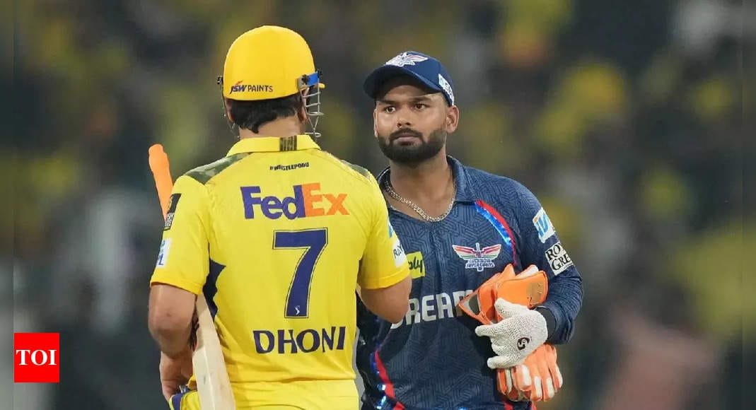 Chennai Super Kings' captain MS Dhoni being congratulated by Lucknow Super Giants’ captain Rishabh Pant…